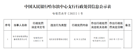 此外,2023年5月,哈银消金曾因“违反征信管理相关规定”,被中国人民银行哈尔滨中心支行处以罚款58万元。