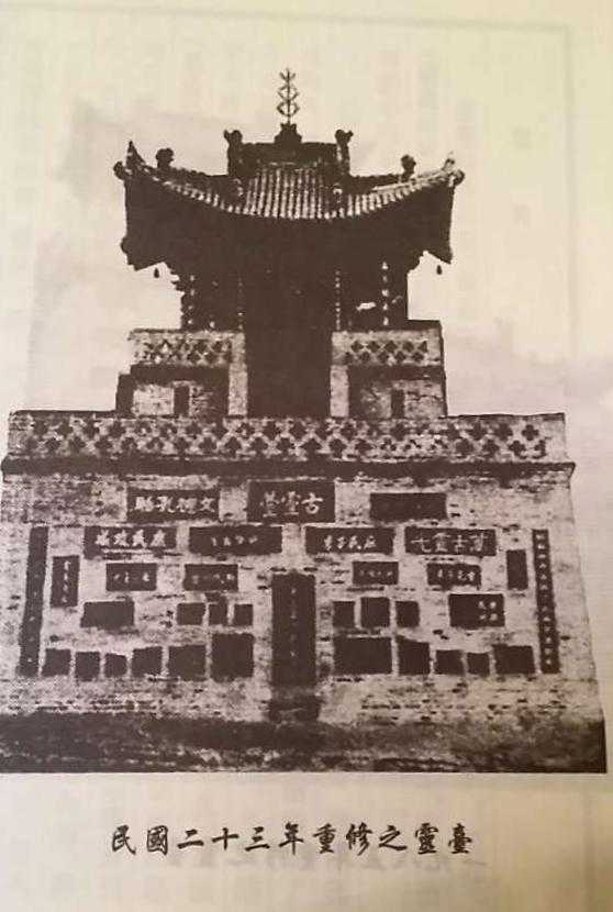 1933年,张东野组织重修灵台,他在《重修灵台记》中回忆说:“二十年夏,余奉命来长灵台,遍查境内古迹风景,多系周秦汉唐所遗留,其最著者为灵台!于是,就原在地加以修建。今台已攻成,计高二丈八尺,建方三丈八尺,台之顶建立八卦亭,内供文王神像,囿沼在望,钟鼓悠然。”