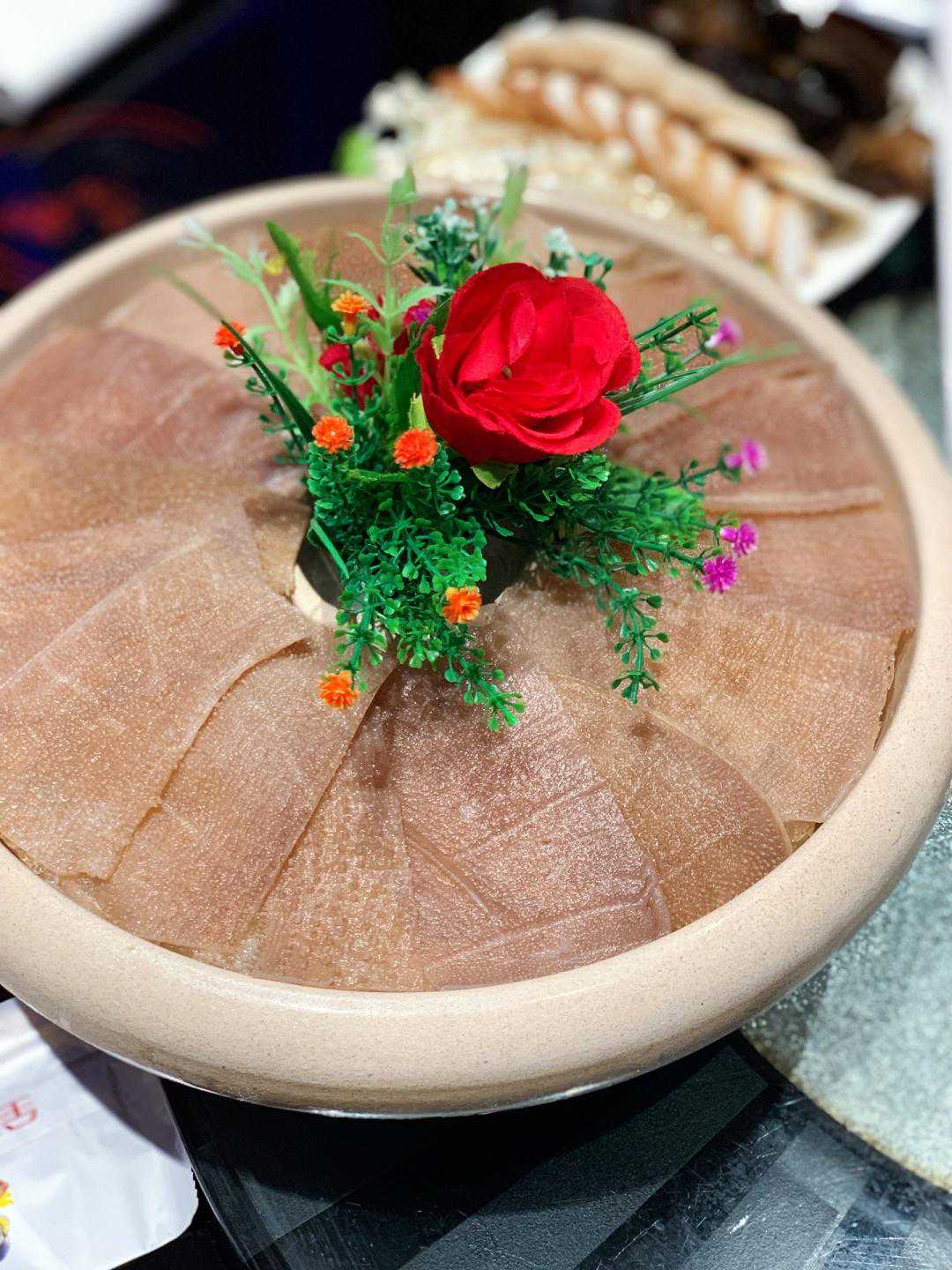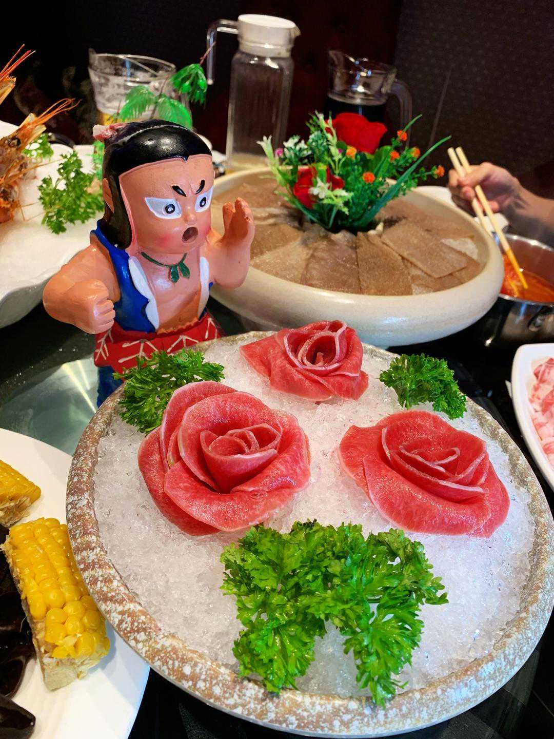 葫芦娃的盘子,端上桌就让人眼前一亮,牛舌被摆成了玫瑰花造型,颜值上就胜了。