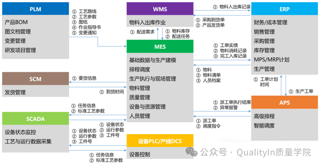 MES和ERP/SCADA:MES直接与生产线操作相关,它桥接了ERP系统和生产过程,提供车间层面的实时数据给ERP系统,同时从SCADA系统收集设备和过程数据,以优化生产执行。