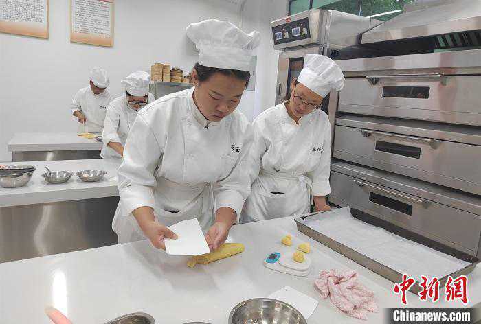 烹饪实训室隔壁的一间训练室里,学生们也在忙活着,揉面、称重、包制……不一会儿,一块块精致的广式点心就成型了。