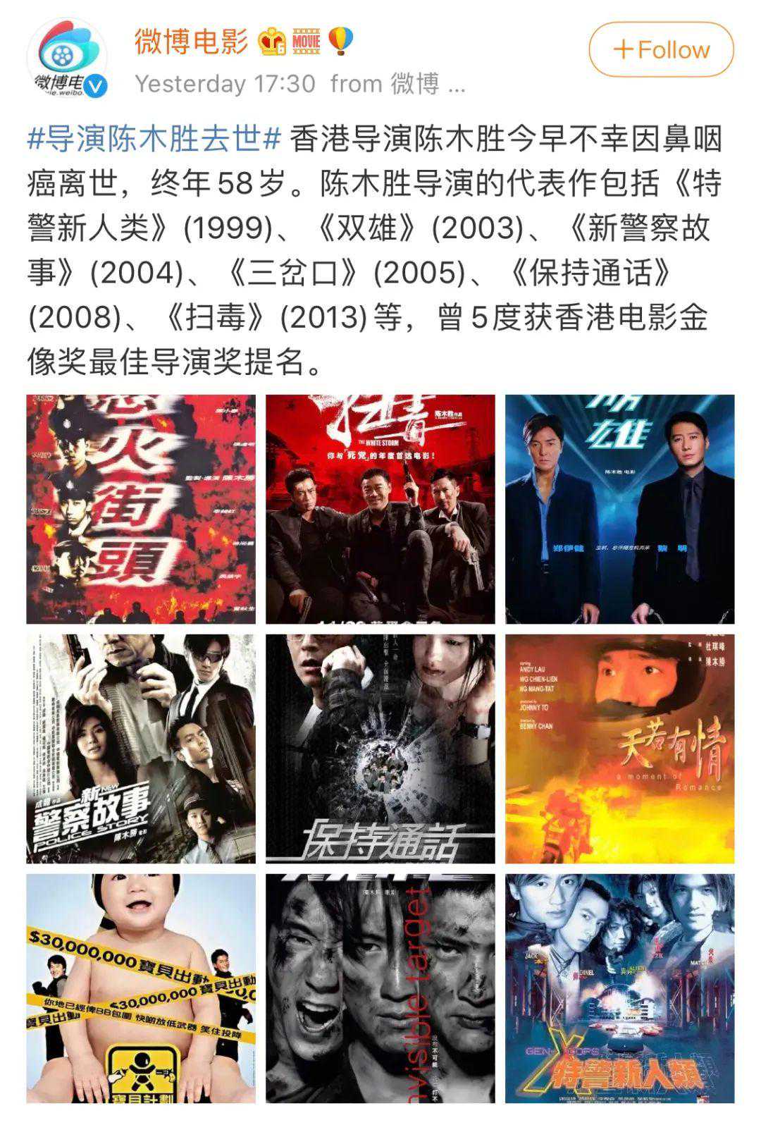 据媒体报道,8月23日,著名导演陈木胜因鼻咽癌离世,终年58岁。