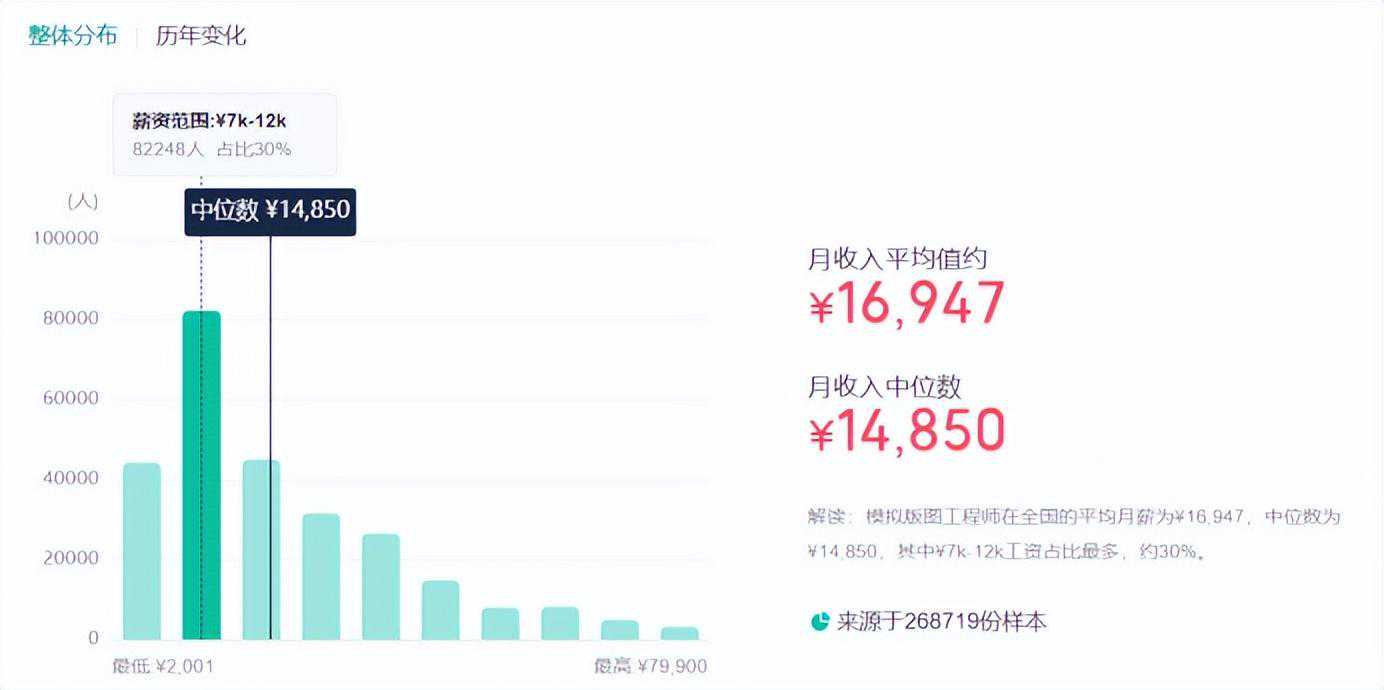 模拟版图岗位的月均薪1.6W左右,同样是因为样本数据比较多,只能做个简单参考。