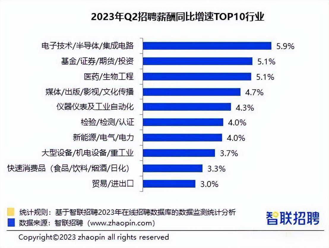 从行业招聘薪酬同比增速来看,电子技术/半导体/集成电路行业增速最高,已经连续两个季度位列第一。第一季度增速7.9%,第二季度增速5.9%。