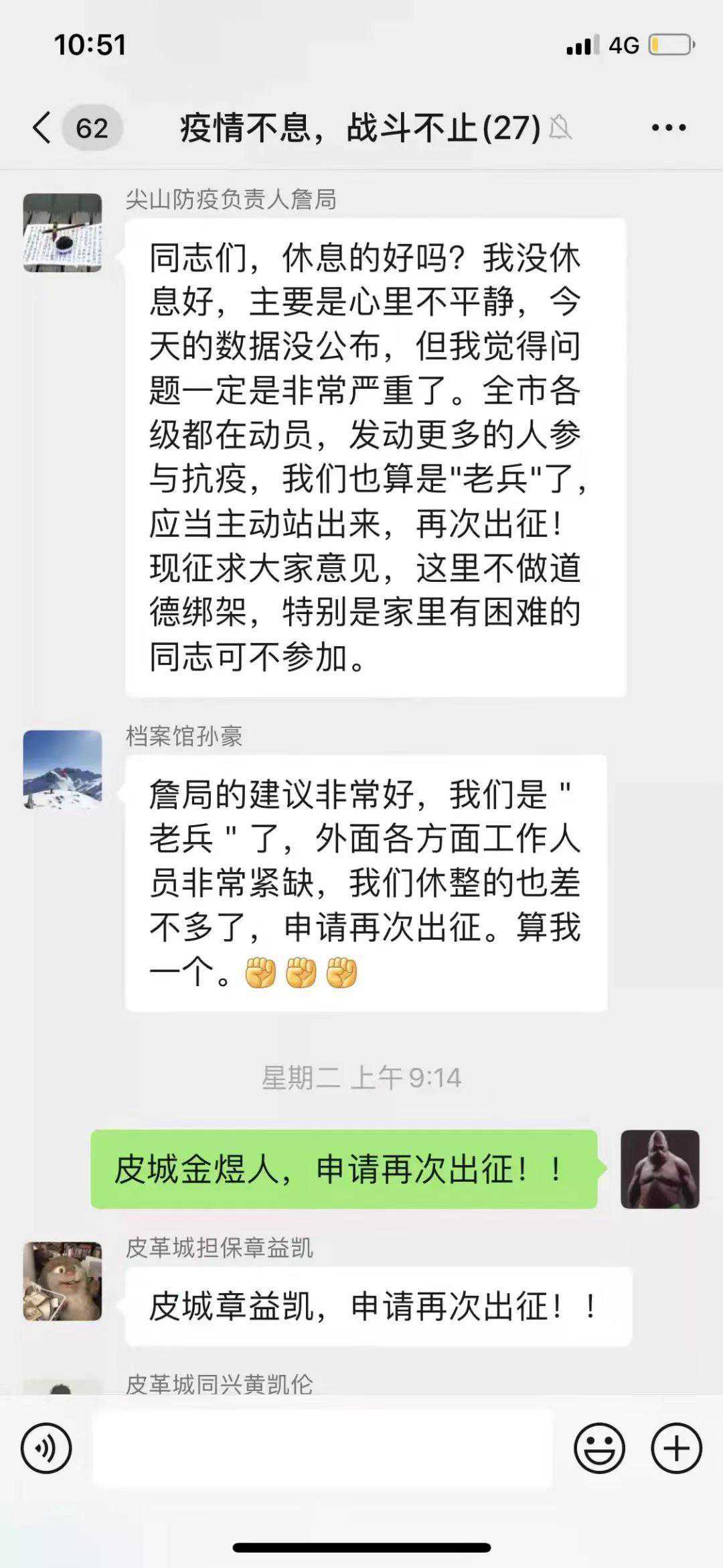 4日晚,金煜人在志愿者群内说起再次出征的想法,大家不谋而合地纷纷响应“大家一起!”就这样,海宁皮革城防疫志愿者再次集结,出征防疫“前线”,金煜人连同黄凯伦、郑其、章益凯、王雨红、吕超杰、郑树强、李丹、羊铖、朱文晶10人志愿者分别赶赴不同隔离点。