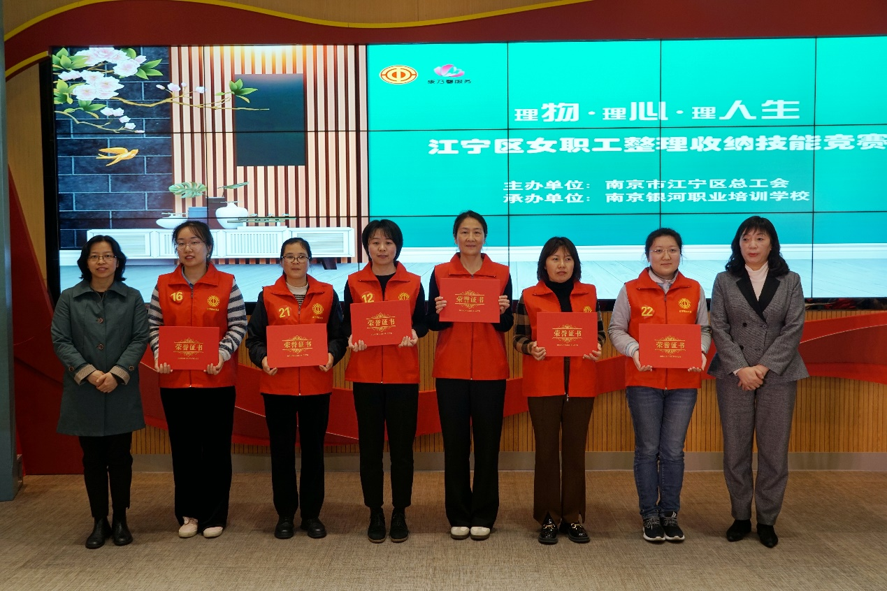 培训结束后,决赛正式开始。通过抽签,选定比赛赛项为办公收纳,每人限时8分钟。裁判们从选手考前考后准备工作流程,收纳工具准备,物品分类,桌面整理,成果展示五个大类及12个细分项进行打分和评判。最终确定优秀奖10名,三等奖3名,二等奖2名,一等奖1名。获一等奖的选手,由区总工会授予“江宁区五一创新能手”;获二、三等奖的选手授予“江宁区五一巾帼标兵”。