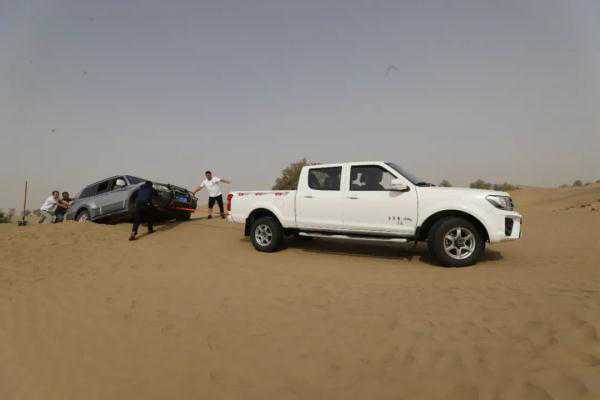9月18日上午,汤博和李永靖所乘坐的车辆陷入距离达里雅布依新村10多公里的沙窝里,杨重祥和文国前对车辆展开施救摄影:崔子璇
