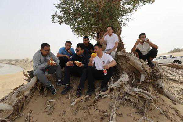9月18日中午,完成达里雅布依新村第二个自动站维护工作后,维护队伍顶着风沙吃着简单的午餐摄影:崔子璇