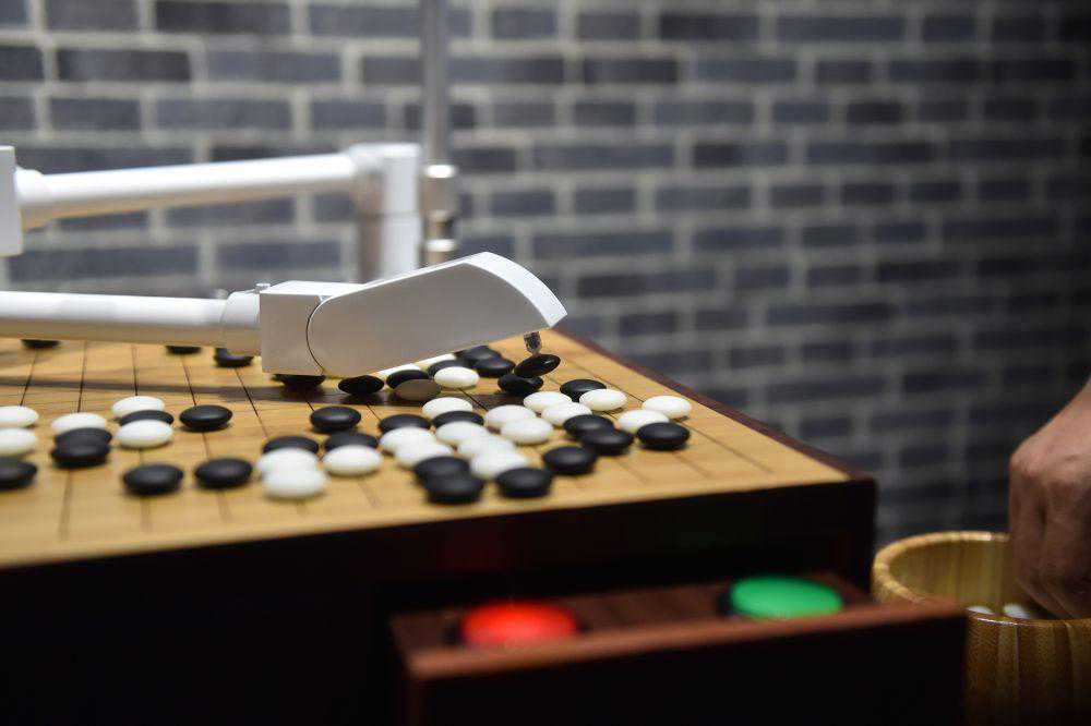 在宁波奇点机器人体验馆,展出的机器人正与一位观众现场围棋“对弈”(黄宗治/摄)