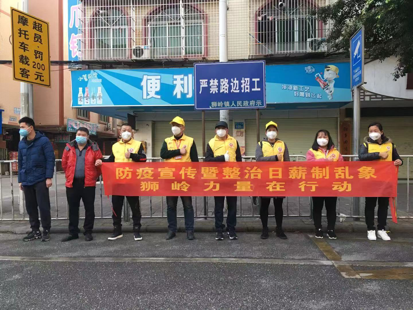 为了增强宣传效果,狮岭镇在各个招工点通过拉挂宣传横幅、张贴整治公告、播放宣传音频等方式,为做好整治工作营造宣传舆论氛围。另外每天组织志愿者到五个招工点维持秩序和宣传疫情防控知识。