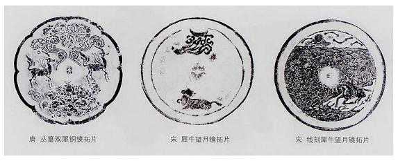 虽然犀牛越来越罕见,但“灵犀”这样的美好意象却越来越深入人心,我们所熟知的李商隐《无题》中便有“心有灵犀一点通”。除此之外,灵犀望月的图像也出现在了唐代铜镜的装饰上(图11)。到了中晚唐,用犀角制成的犀带成为帝国最高品级的官员的腰带佩饰,甚至可与玉相提并论。据《新唐书·志第十四·车服》中的记载,唐文宗在即位后,由于四方车服僭奢,下诏准仪制令:“诸亲朝贺宴会之服,一品、二品服玉及通犀,三品服花犀、班犀”,其中的通犀、花犀、班犀指的是不同类型的犀牛角,只有三品以上的高官才能身配犀带。李德裕在大和八年(834年)写下了《通犀带赋》,其中对通犀带极尽赞美之词:“灵可御邪,光能远烛……温兮如玉气舒虹,粲兮若晨光烁霞”。