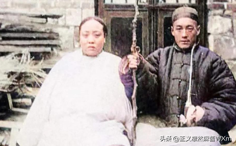 (12)地主与正妻闲坐,男持枣杖吸水烟,女富态丰腴。两侧鸟笼添雅趣,虽院乱,砖瓦房显大户气派。