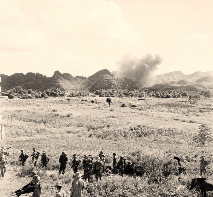 (06)1953年7月,越南奠边府战役。图1,作战中的法军士兵身边的宣传画~~毛泽东已经是与斯大林平起平坐的社会主义阵营领袖。图3,法军士兵在看宣传画《保卫我们的祖国》其中一幅是天安门广场检阅。图5,弹药箱上的汉字。图6,山洞里的弹药库。弹药箱上隐约可见汉字。图7,法军背后的里程墙上标注此地至中越