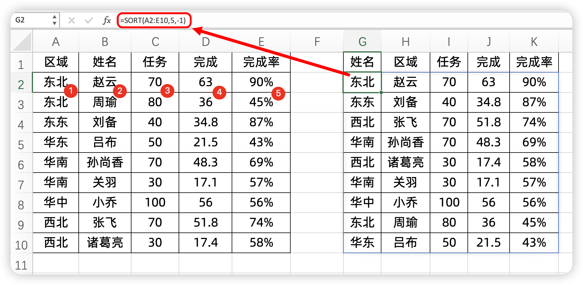 例如,我们想要对完成率进行降序排列,我们可以使用公式: