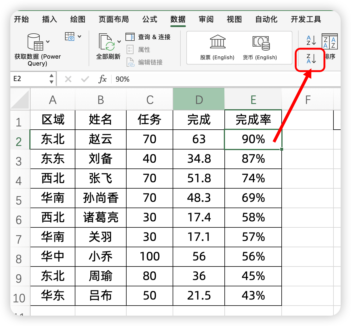 然后领导想看到的是,按照完成率的降序来排列这个表格
