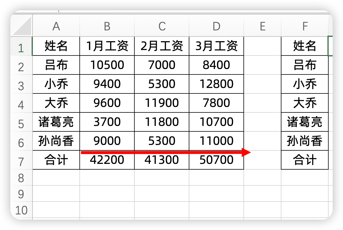 例如,我们想按照合计的工资数据,进行横向的排序