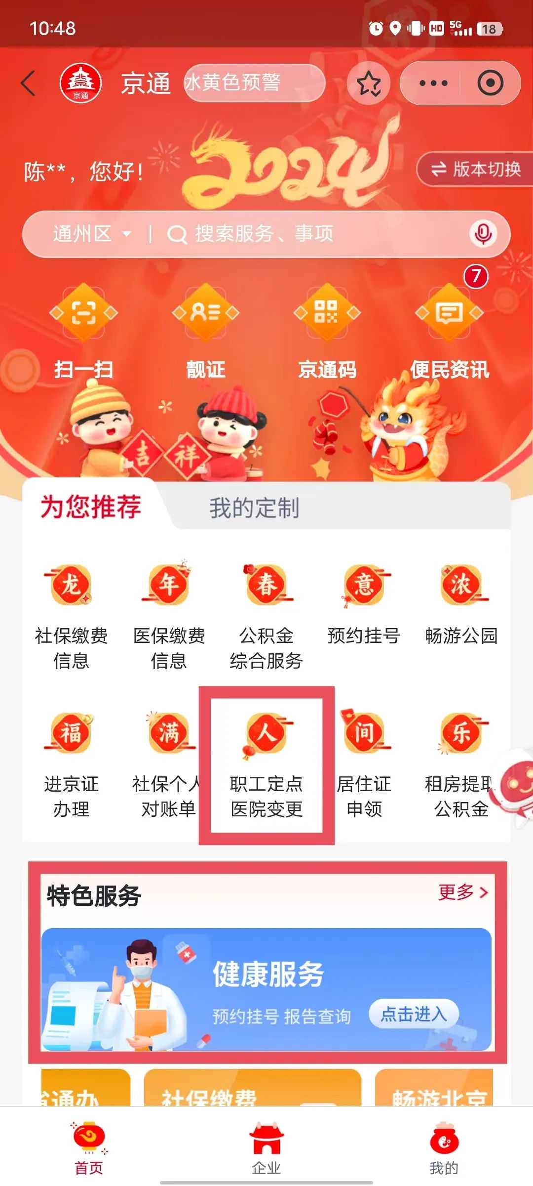 1.“京通”小程序通过“个人定点查询修改”或“健康服务”板块进入;