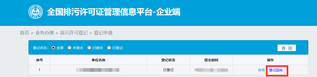 提交后返回到登记申请页面,可下载登记回执。打印排污登记表和回执后留存备查。