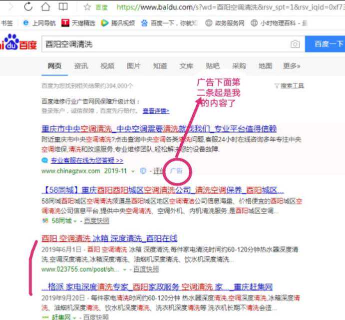 图3搜“酉阳空调清洗”朋友们都可以在百度搜索试试,广告后2、3条百度快照是小编的关键词