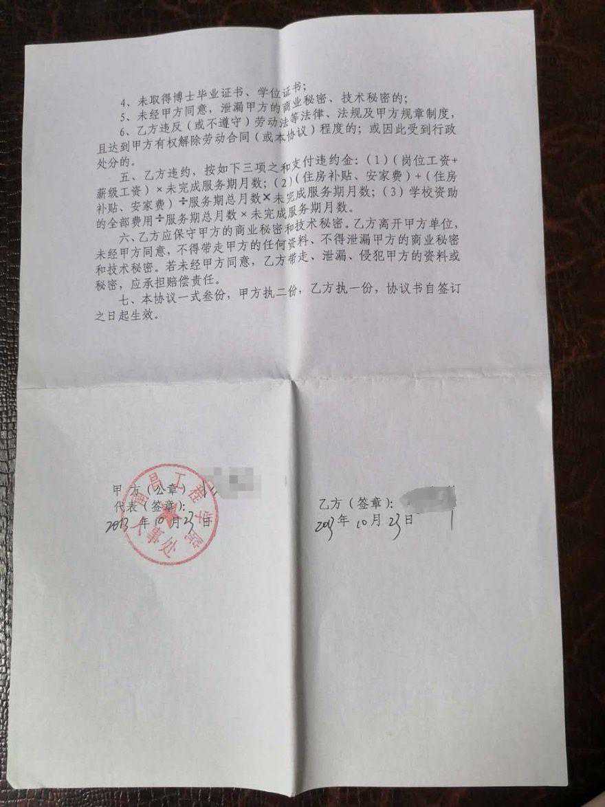 《南昌工程学院委培高学历人才服务期协议书》。本文图片受访者提供