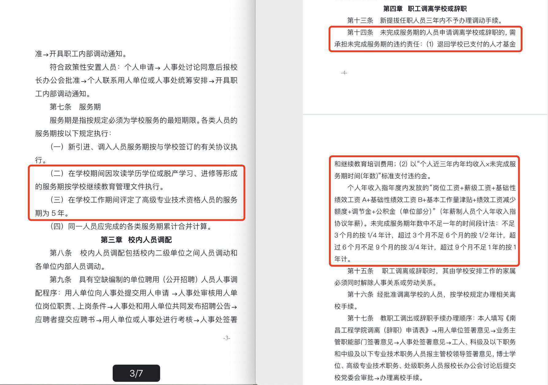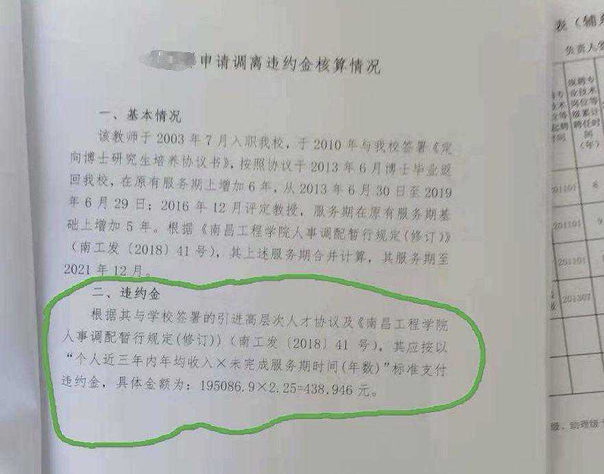 “博士服务期满了没算违约金,是胡宁评上教授后另有5年服务期,还没满。金额数是按《南昌工程学院人事调配暂行规定(修订)》【南工发〔2018〕41号】上有关规定核算出来的。”学校人事处办事人员给出答复。