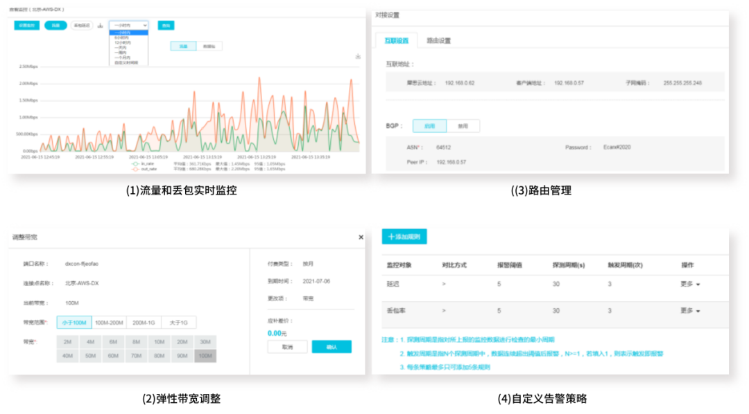 云专线支持线上申请、定义、购买和管理自己的网络,提供告警配置、实时监控、流量图等功能,提高开通效率,减少运维工作的复杂性;