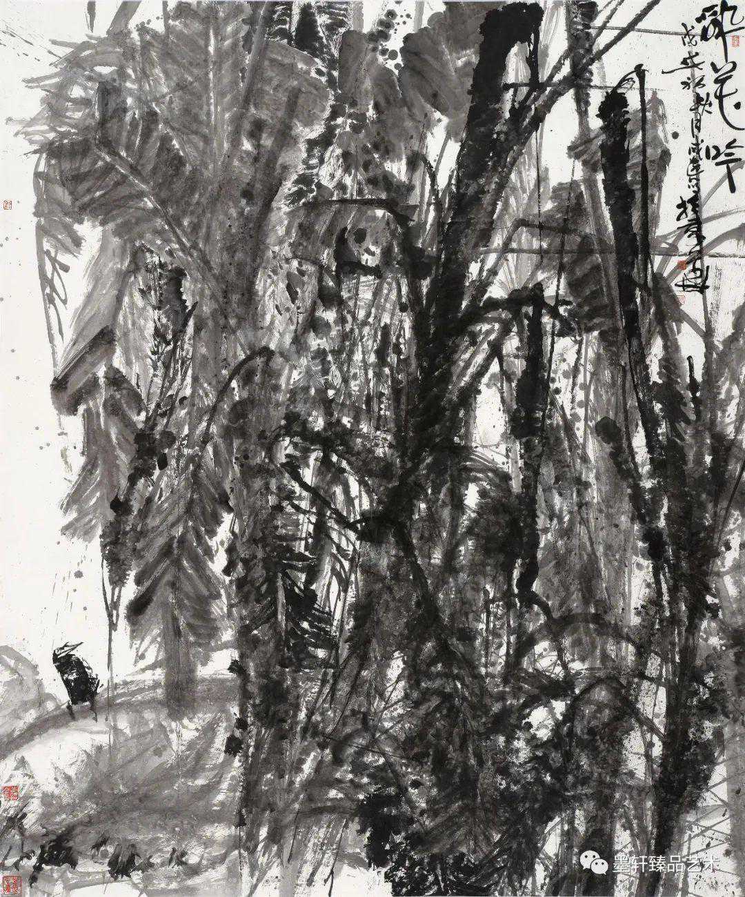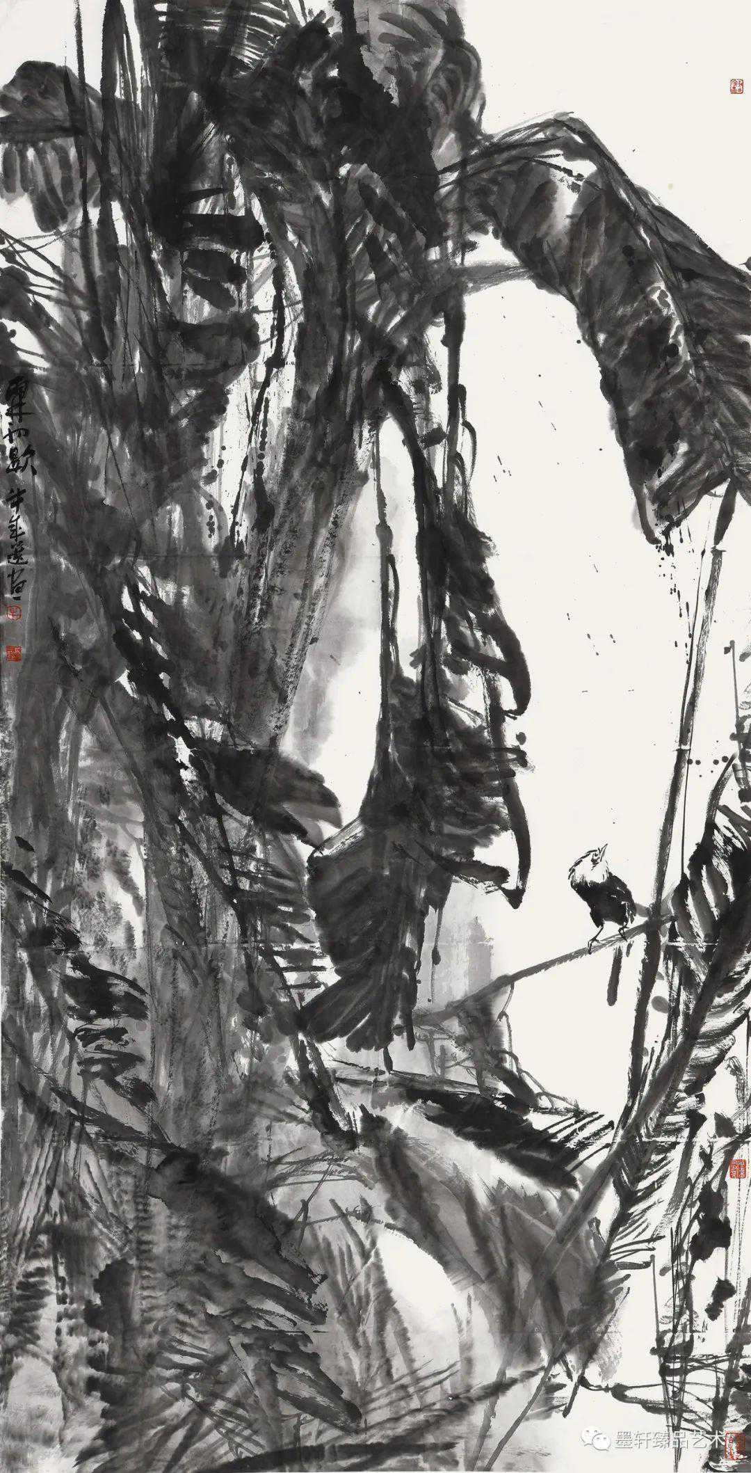 偶于展厅见牛成选写意芭蕉之作。其笔墨快斫劲健而不失浑厚,舒畅洒脱又不落与荒率,布局张力十足又不失结构谨严。浑浑然有央美张立辰、于光华诸师之风。其墨干湿浓淡一任自然,其笔快意挥洒万毫齐力,其构图起承转合直起横破契和自然神往之境。成选的花鸟画路子正、笔墨强、潜力大。