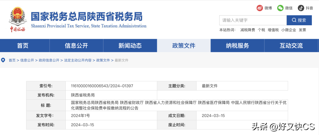 2024年3月15日,陕西省税务局发布了《国家税务总局陕西省税务局陕西省财政厅陕西省人力资源和社会保障厅陕西省医疗保障局中国人民银行陕西省分行关于优化调整社会保险费申报缴纳流程的公告》,明确自4月1日起优化调整社保申报缴费流程。
