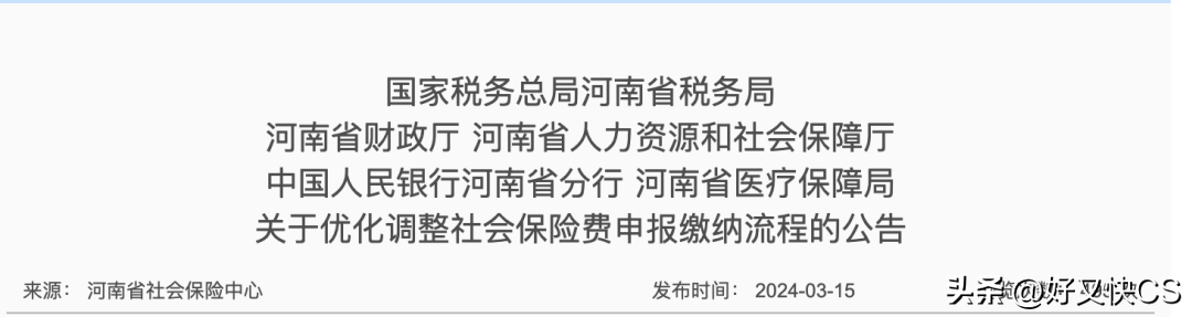 2024年3月15日,河南省税务局发布了《国家税务总局河南省税务局河南省财政厅河南省人力资源和社会保障厅中国人民银行河南省分行河南省医疗保障局关于优化调整社会保险费申报缴纳流程的公告》。