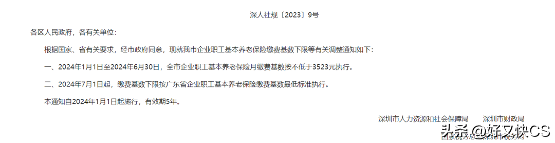 这次调整对于养老保险而言,最低缴费基数由原本的2360元大幅提升至3523元,相当于2022年广东省全口径社平工资8807元的40%。
