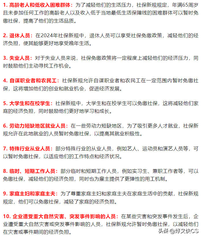 据最新规定,以下10类人可以享受社保免缴待遇。