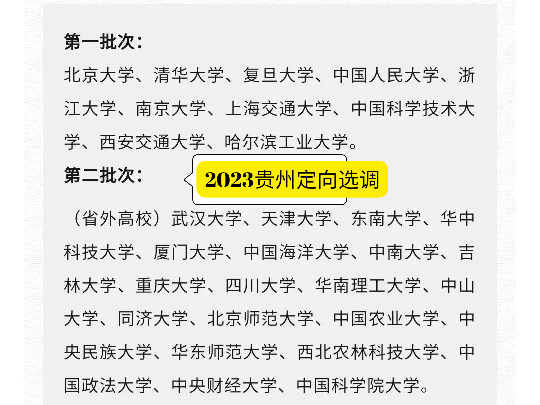 先来看2023年的贵州定向选调的大体格局,当时总共分为两个批次。其中第1批次是c9的高校,加中国人民大学共10所985大学,算是我国的顶级高校一网打尽;第2批次是其他的18所985大学,加中国科学院大学,中国政法大学和中央财经大学,另外还包括贵州省内包括贵州大学在内的8所知名大学。