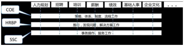 COE:人力资源专业知识中心或人力资源领域专家,职能高,属于三支柱的政策中心,工作内容主要是制定总体的人力资源战略、政策、流程、体系、方案等;