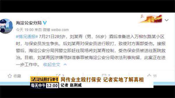 事后民警马上赶到,将被打保安送上了救护车,同时找到了打人者刘某,刘某今年56岁,目前已被海淀公安拘留。