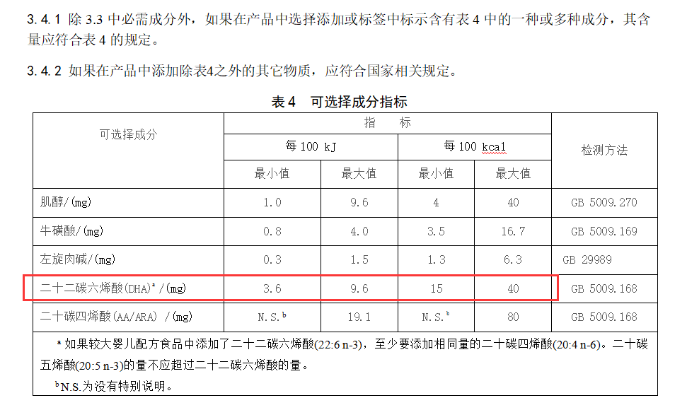 然后我们再来看标准,目前现行的国标《GB10765-2010食品安全国家标准婴儿配方食品》及《GB10767-2010食品安全国家标准较大婴儿和幼儿配方食品》中,DHA属于可选择性营养成分,没有硬性要求添加,在含量方面,只要求最高含量不能超过总脂肪酸的0.5%,对最低含量没有作特别说明。
