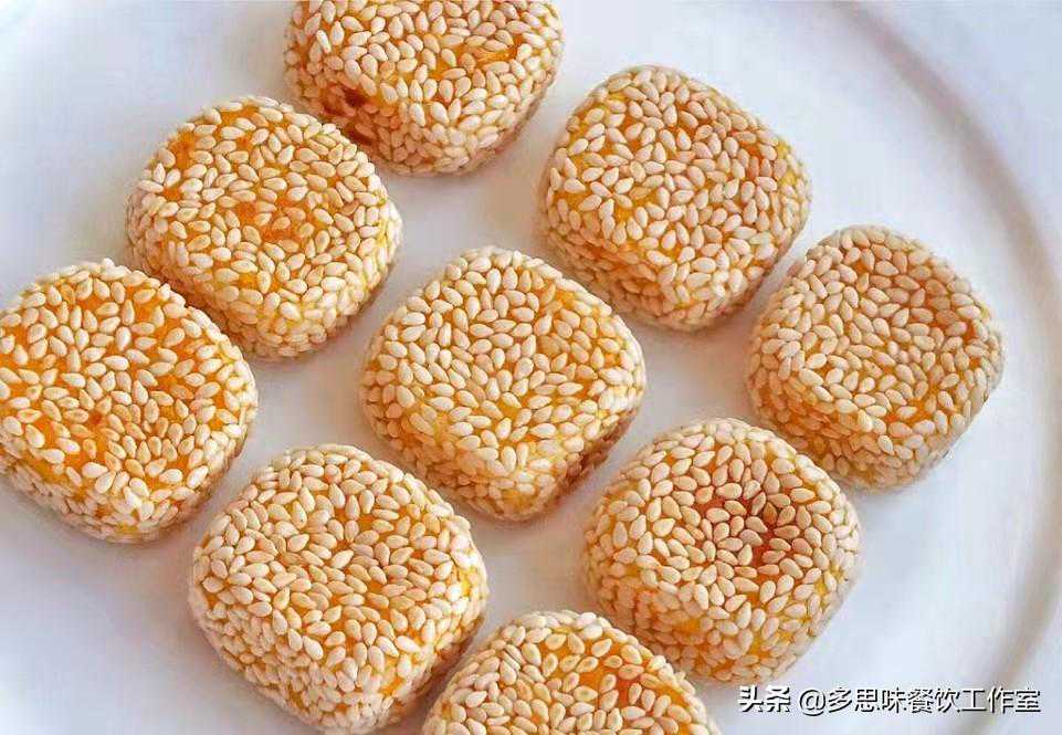 2取小撮面团搓成圆球,裹上白芝麻,用手压成小方块,也可以根据自己的喜欢搓成小球或小饼。