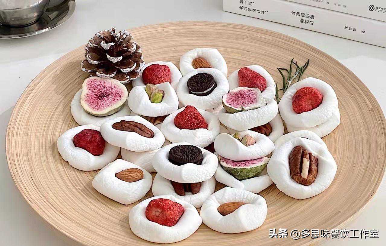 3趁热迅速把水果干,奥利奥,坚果压进变胖的棉花糖里,这一步简直太解压了