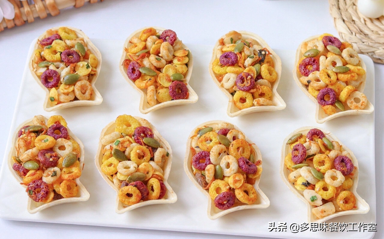 食材:蛋清20克、糖粉8克、黄油8克、海盐1克、低筋面粉3克、玉米淀粉2克、谷物圈65克、夏威夷果、肉松55克、香葱5克、椰子片、南瓜子、糯米鱼12个。