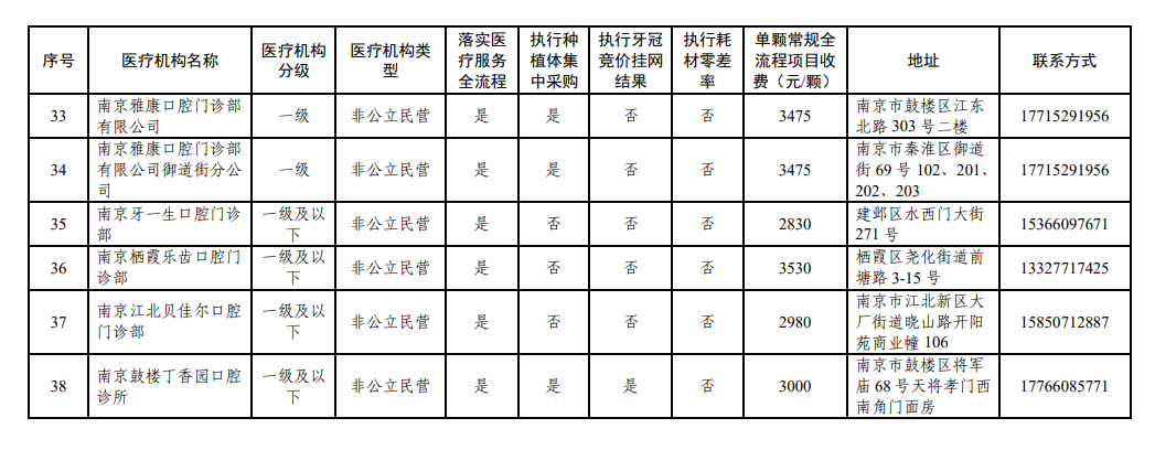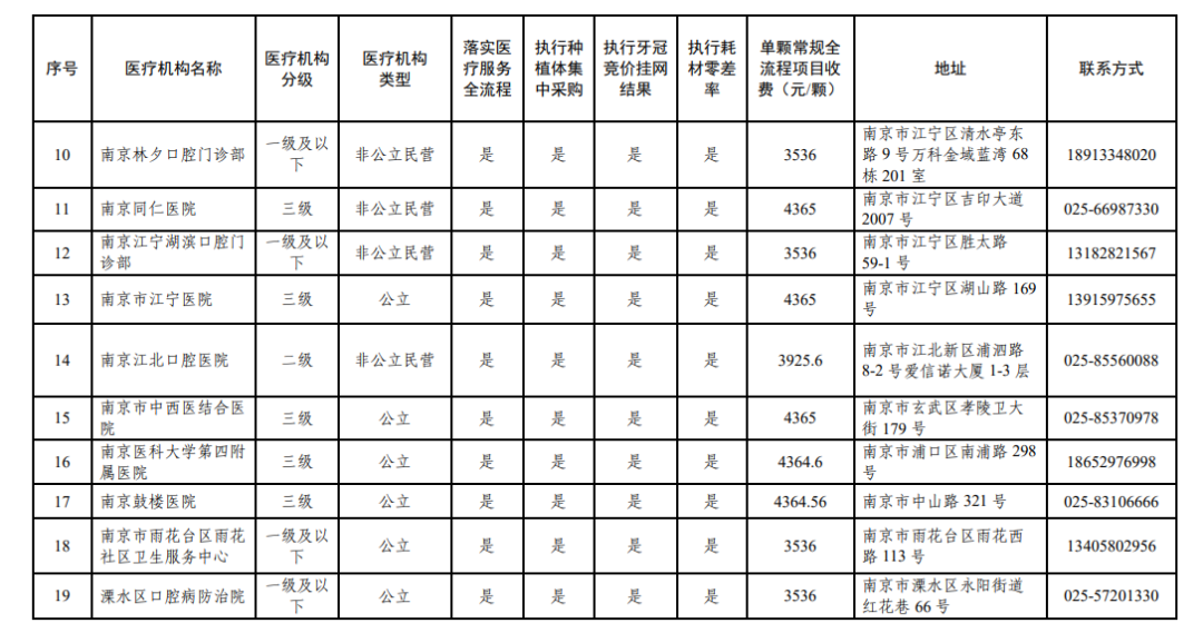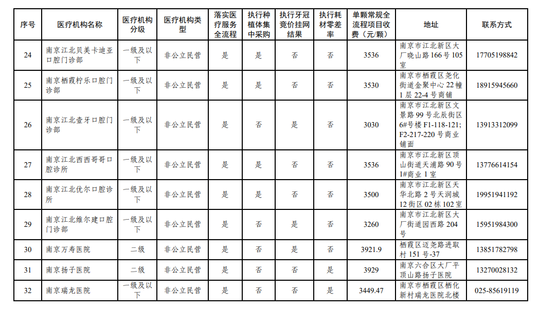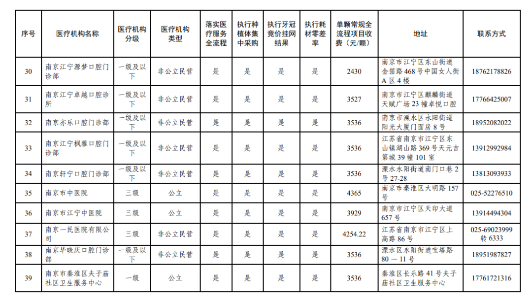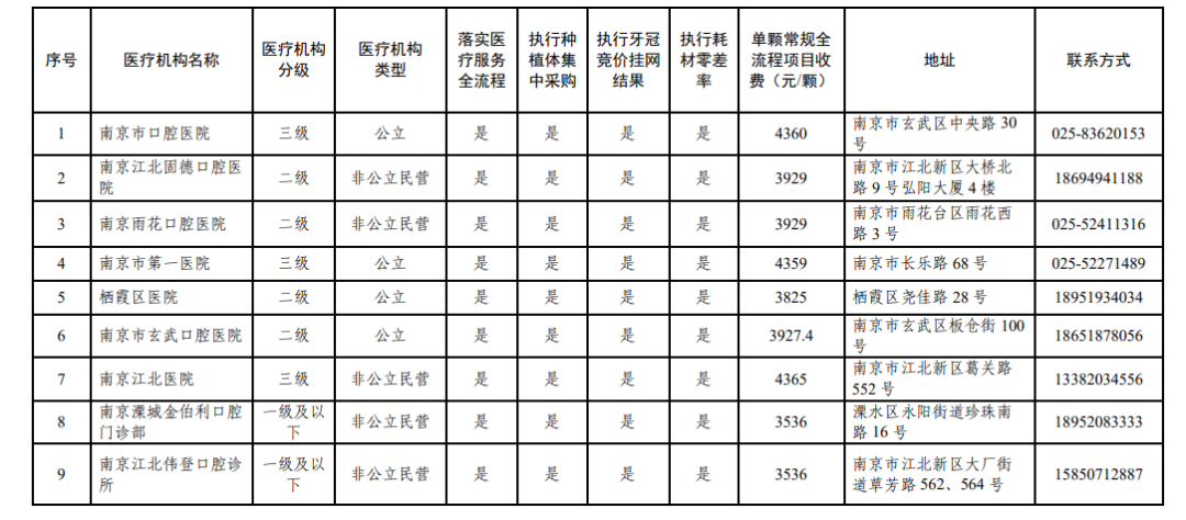 南京市接受价格全流程调控、参加口腔种植耗材集采、牙冠竞价挂网以及执行耗材零差率医疗机构名单