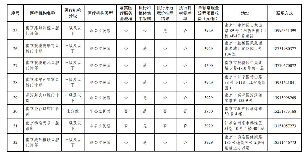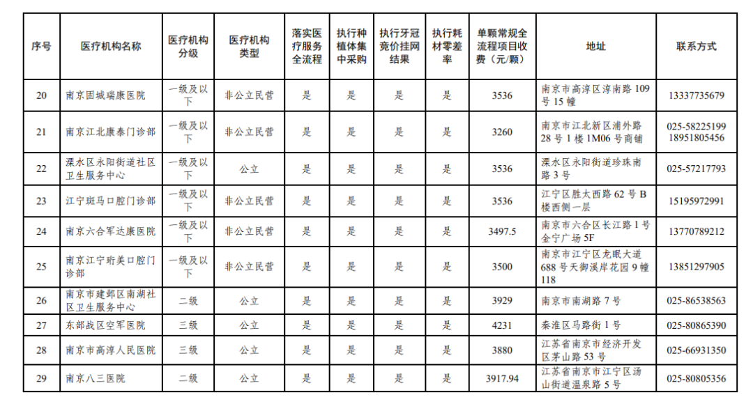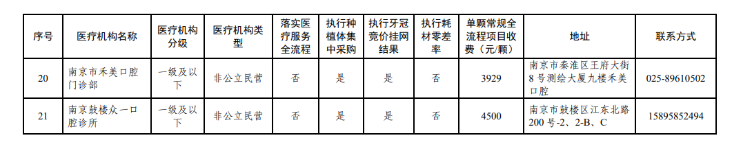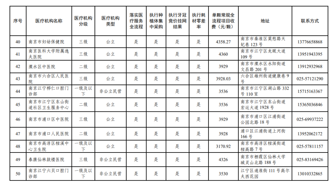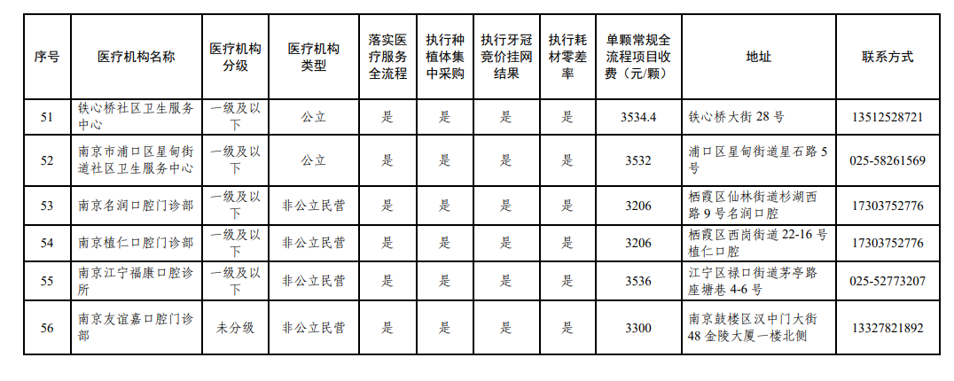 南京市部分参加口腔种植耗材集采、牙冠竞价挂网医疗机构名单