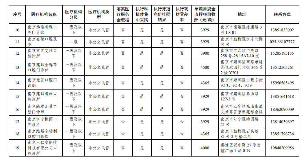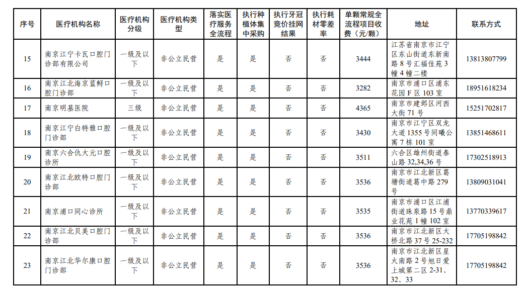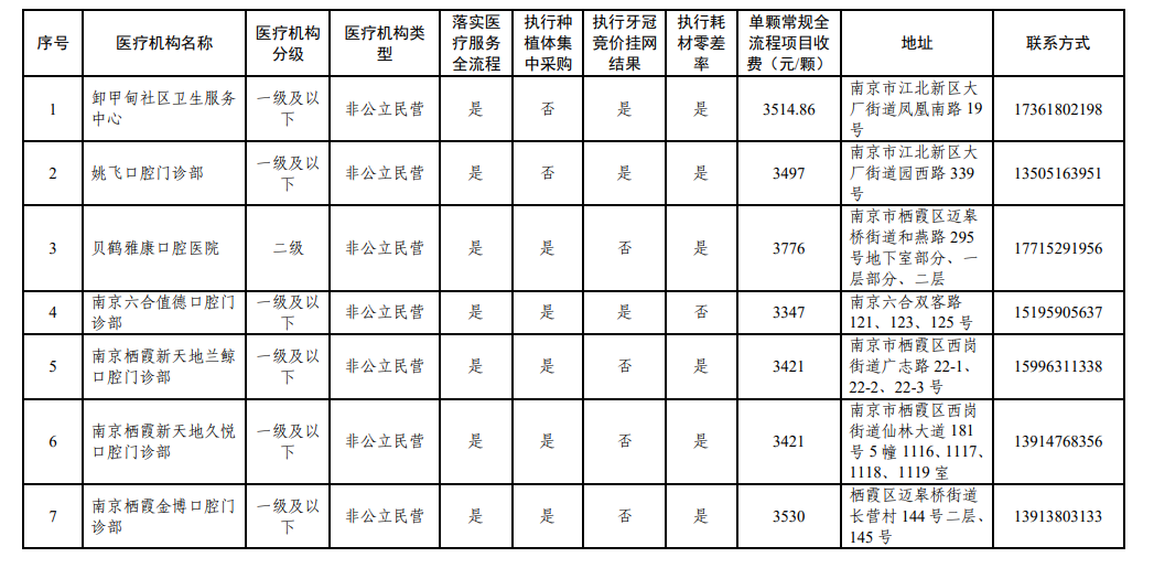 南京市参加口腔种植耗材集采、牙冠竞价挂网医疗机构名单