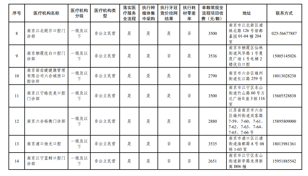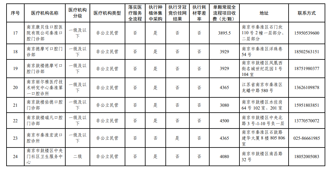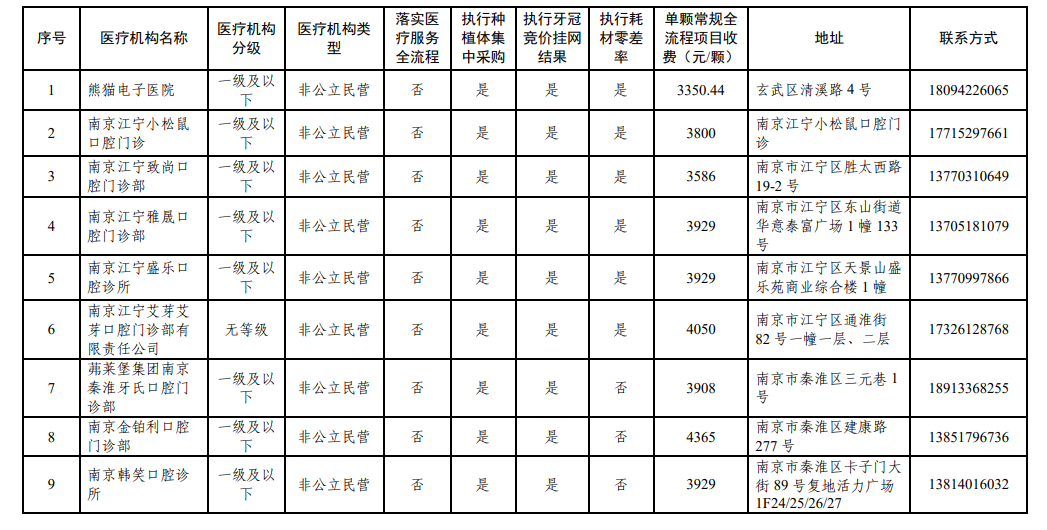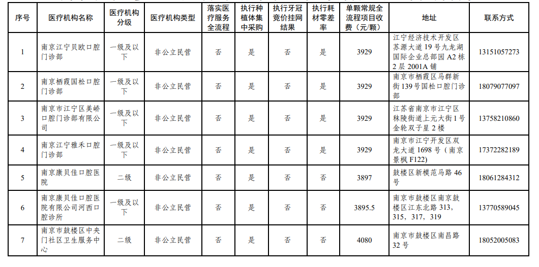 南京市医保局日前发布《关于南京市参加口腔种植医疗服务收费和耗材价格专项治理医疗机构名单的公示》。
