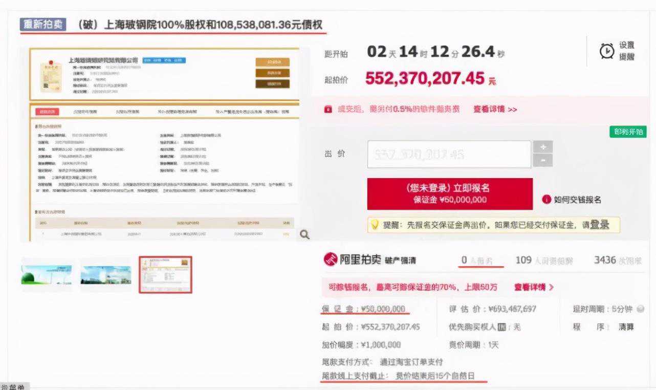 目前,上海玻钢院100%股权和1.08亿元债权已经重新上网开拍,将于12月3日开始第四次拍卖。起拍价仍未5.52亿元,但是拍卖保证金已经提高到了5000万。且拍卖公告中明确,