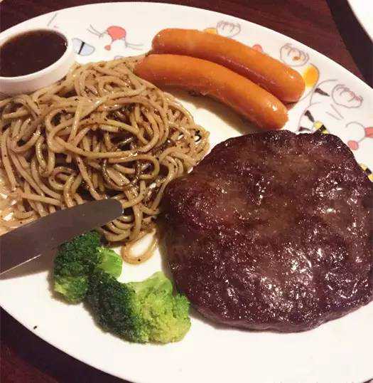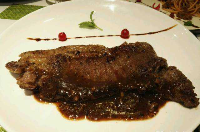 牛排九分熟就有些老了,不过肉质还算不错,黑胡椒汁也挺正宗。不过肉眼牛排里面是带筋的,不喜欢的要注意啦。