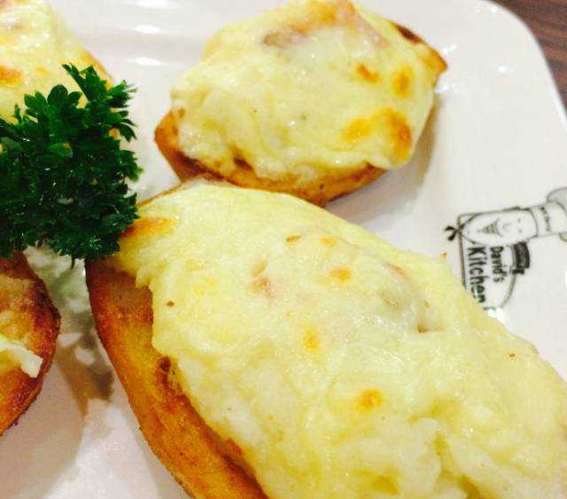 芝士焗土豆很特别但也不是很惊艳,土豆不去皮,直接横切一半,上面撒了很多芝士,勺子挖起来拉丝,半个挺有分量的。