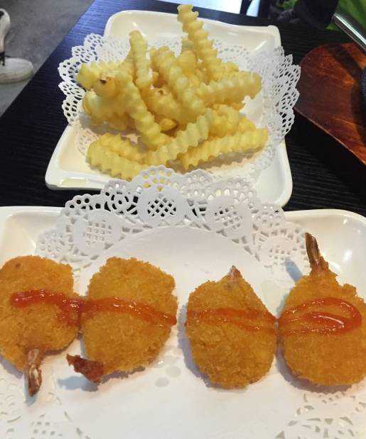 薯条要趁热吃,否则就不脆了,黄金蝴蝶虾外面的粉略厚了一点,盖过虾的鲜味了,薄一点就完美了。