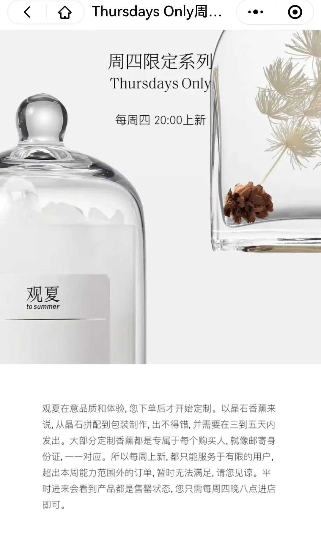 他们固定在每周周四晚上八点,于观夏小程序上线。限量销售,时常断货。