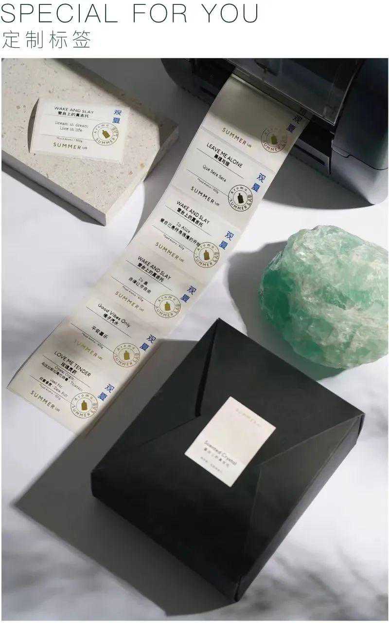晶石香氛不仅本身产品内涵动人,它还能在标签上做定制。2019年的观夏在文章里说,每一个标签都是打出来人工贴标的,以此来传递一份心意与温度。不仅如此还有诸多讲究,比如提到标签纸是日本大阪的纸商所做,标签上要丝印要戳章。(后来才逐渐简化)