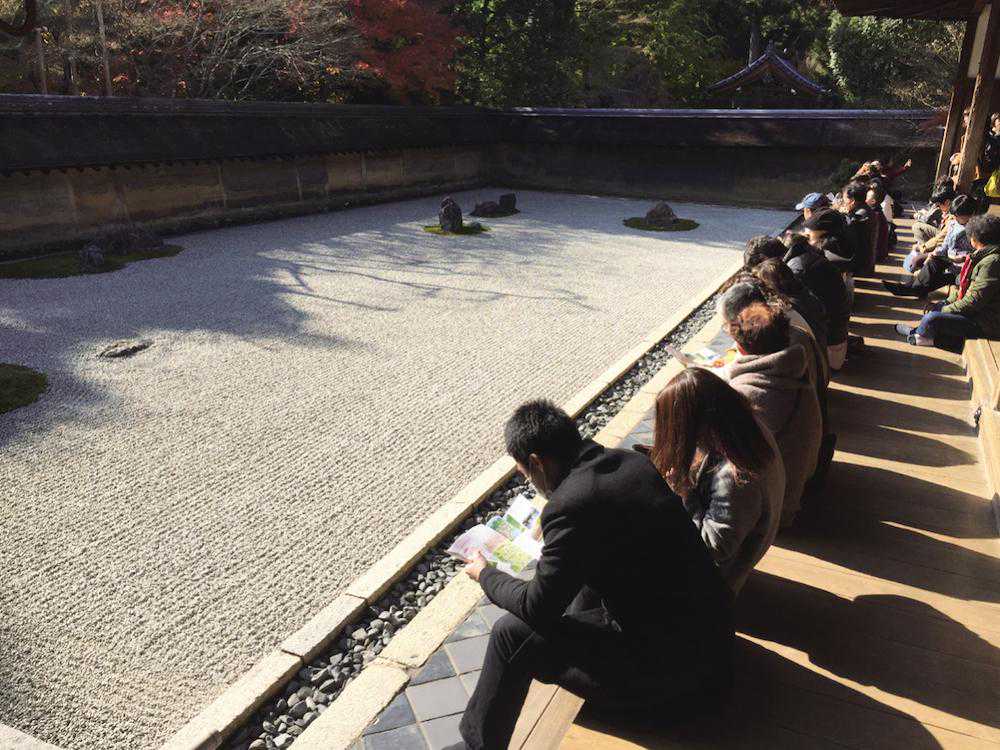 其实完全不奇怪,一大堆人围着观看一个250平方米的长方形庭园,哪怕是都不说话,但拥围在一起的人群都会产生高强度的嘈杂。如果是一个人坐在那里,与庭园对视,就一定会有特别的感受,但作为目前京都观光业的招牌景点,龙安寺的嘈杂和拥簇几乎是不可避免的了。