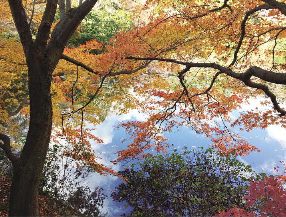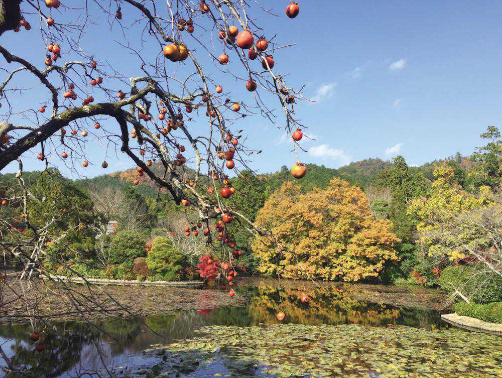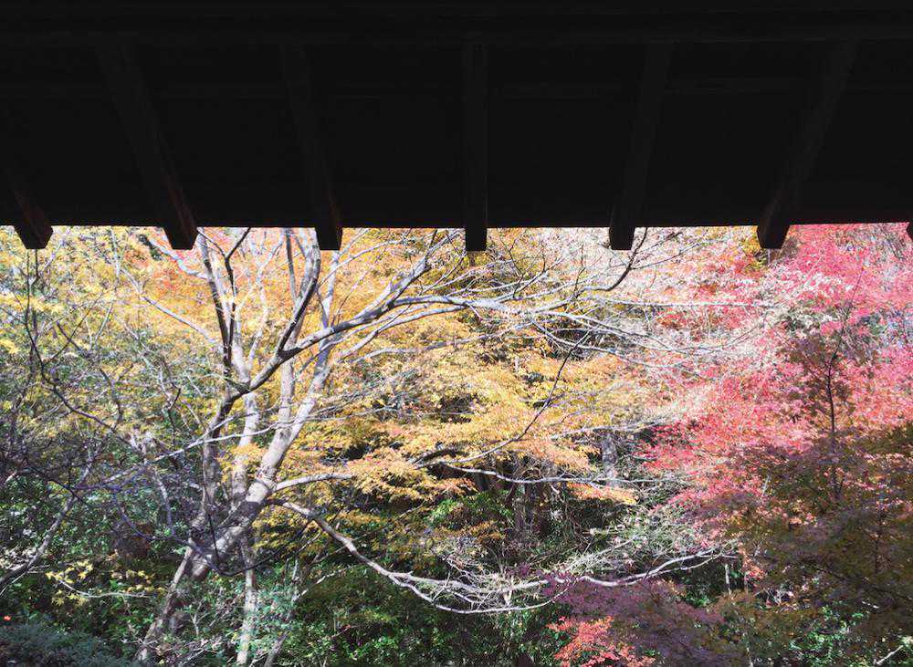 后园里一角黄叶和红叶充盈的图画在檐柱中被框出来。